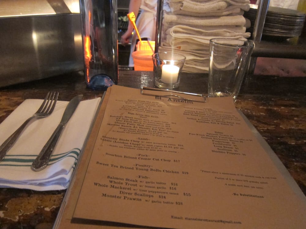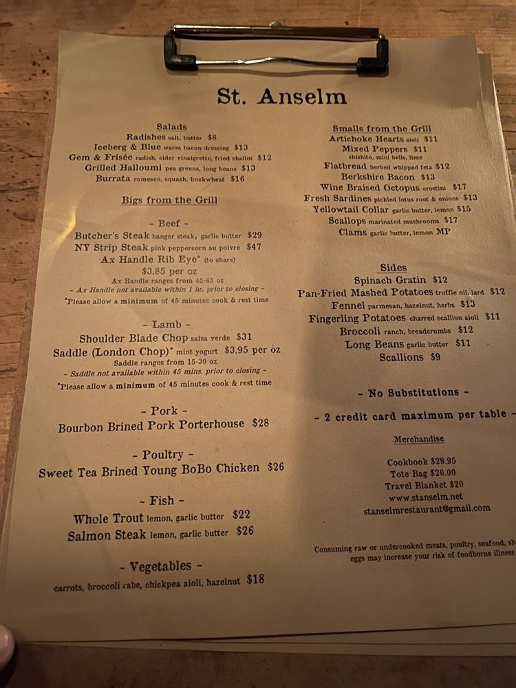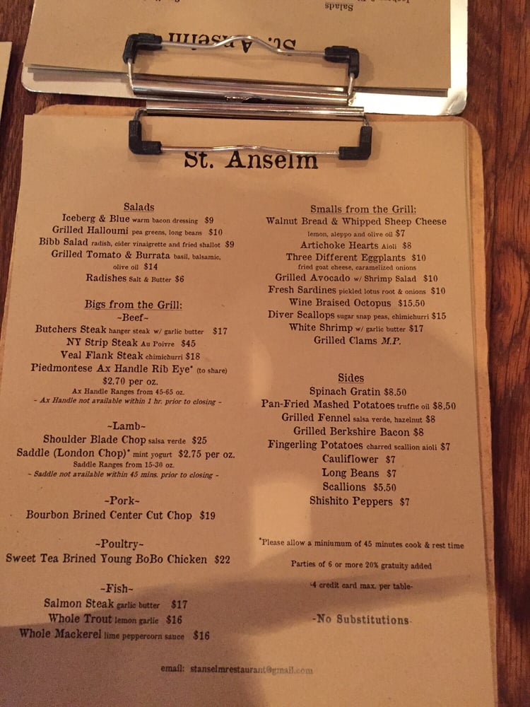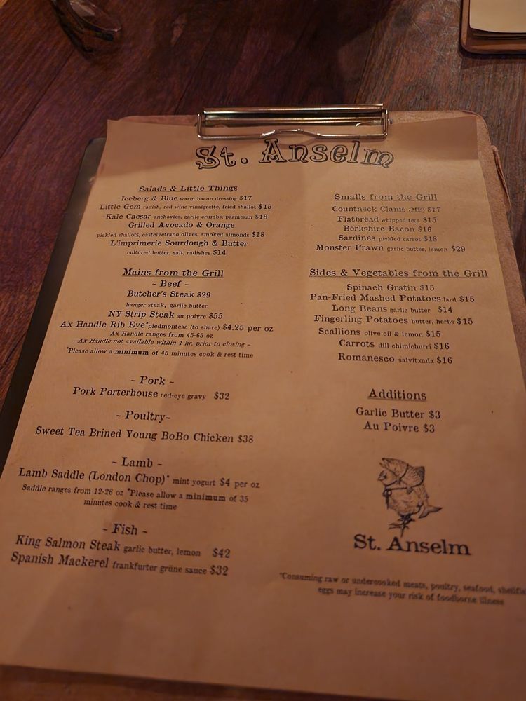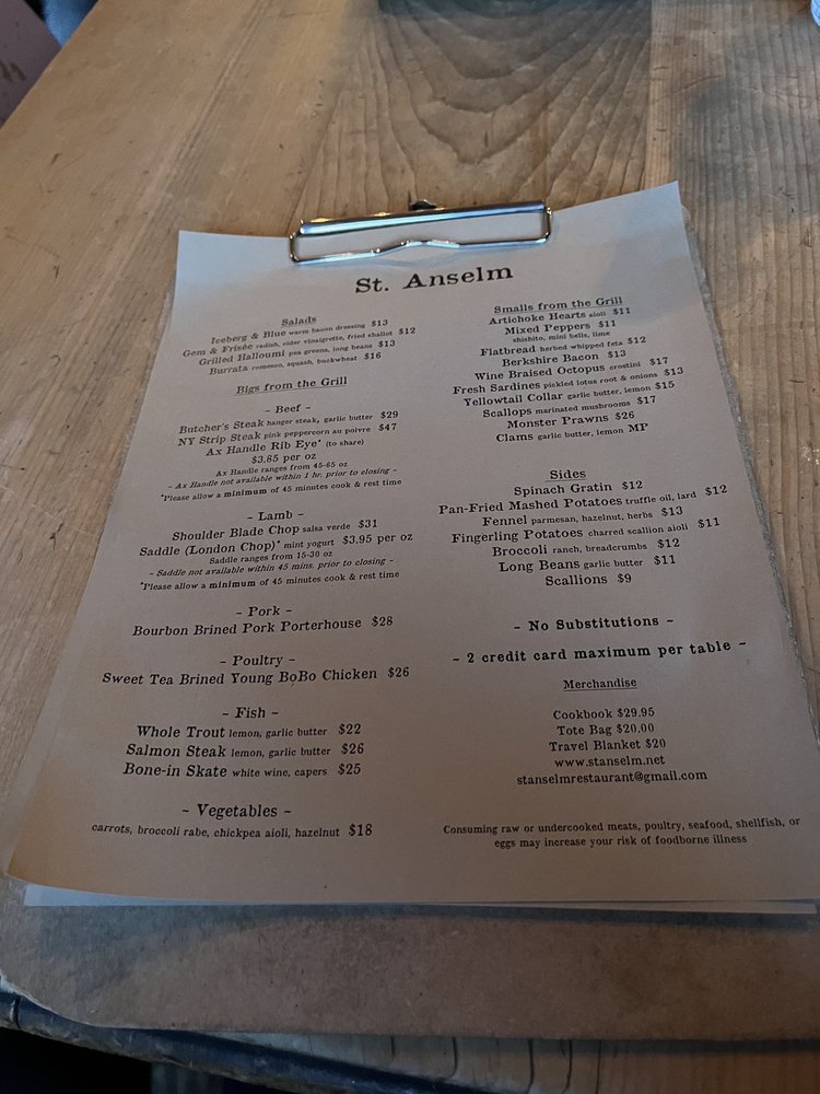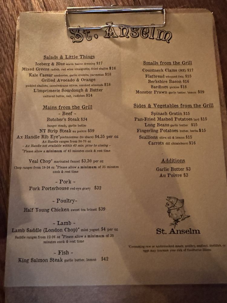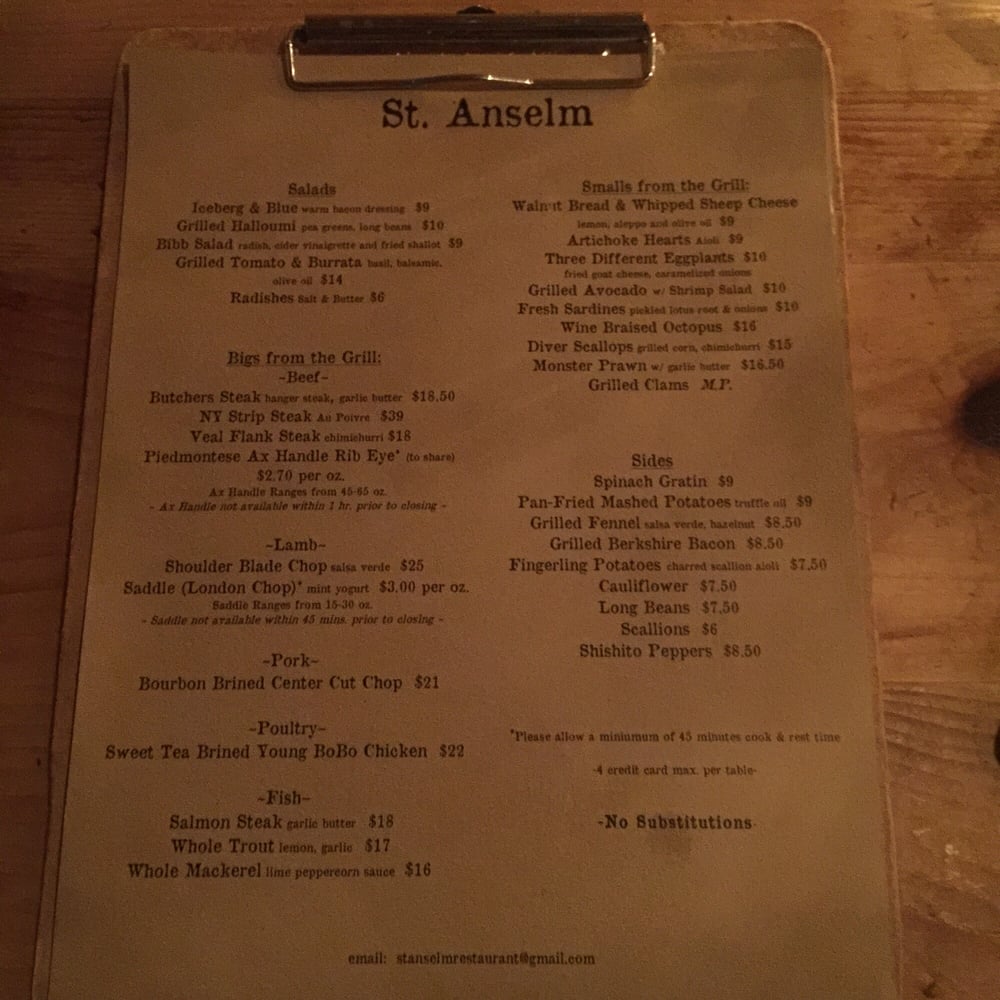 Welcome to St. Anselm, a unique blend of a wine bar, New American cuisine, and steakhouse in the heart of Brooklyn. This trendy spot offers a variety of small plates like the Radicchio lemon pepper caesar and Winter Radish fennel crunch, along with delectable grilled dishes such as the Cider Brined Pork Porterhouse and the Butcher's Steak. Customers rave about the cozy atmosphere and attentive service at St. Anselm.
